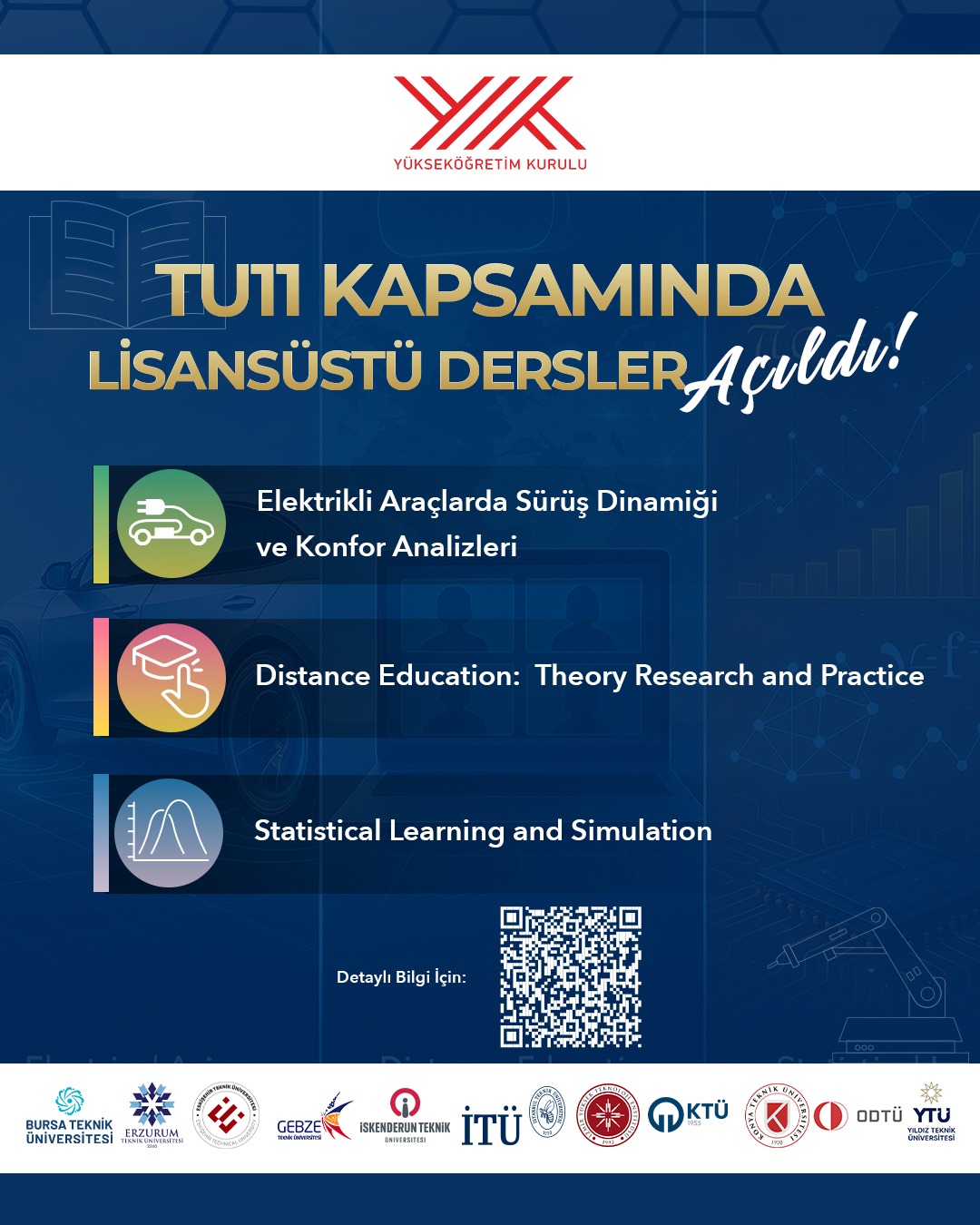 Teknik Üniversiteler Birliği (TU11) kapsamında, 2025-2026 Eğitim-Öğretim Yılı Güz Yarıyılı içerisinde tüm teknik üniversitelerin lisansüstü öğrencilerinin seçebileceği bir Türkçe ve iki İngilizce olmak üzere toplam üç ortak seçmeli ders açılmıştır.