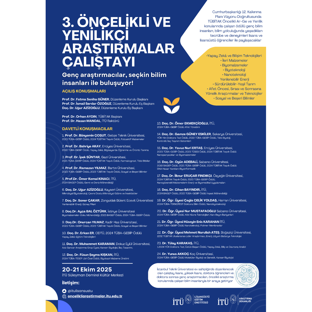 İstanbul Teknik Üniversitesi ev sahipliğinde 20-21 Ekim 2025 tarihinde düzenlenecek olan “3. ÖNCELİKLİ VE YENİLİKÇİ ARAŞTIRMALAR ÇALIŞTAYI” lisans, yüksek lisans, doktora ve doktora sonrası genç araştırmacıları, öncelikli araştırma konularında çalışan bilim insanlarıyla bir araya getiriyor.